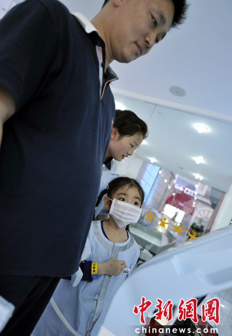 圖為孩子在體驗(yàn)做一名護(hù)士,為家人體檢。 中新網(wǎng)記者 王紅綱 攝