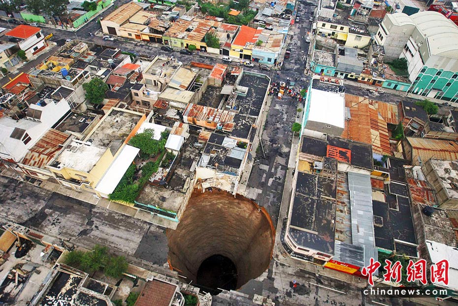 5月31日,受颶風“阿加莎”的影響,危地馬拉首都危地馬拉城出現一個深達60米塌陷洞,有目擊稱一幢3層建筑墜入洞中,至少造成1人死亡。圖片來源:中國新聞網