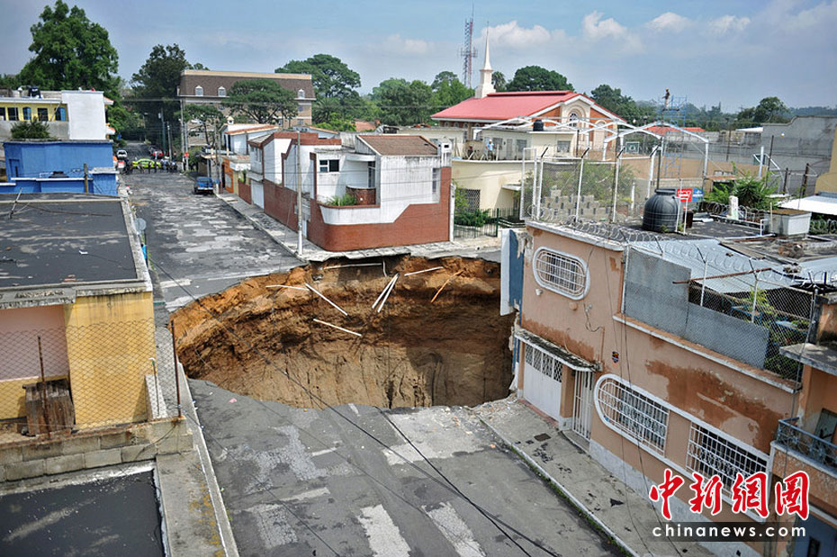 5月31日,受颶風(fēng)“阿加莎”的影響,危地馬拉首都危地馬拉城出現(xiàn)一個(gè)深達(dá)60米塌陷洞,有目擊稱一幢3層建筑墜入洞中,至少造成1人死亡。圖片來源:中國(guó)新聞網(wǎng)