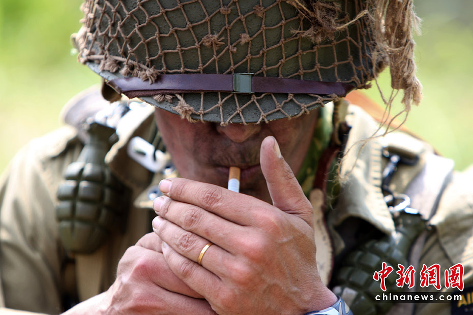 6月5日,諾曼底登陸66周年前夕,一批演員身著二戰(zhàn)時(shí)期美軍軍服,在法國(guó)諾曼底卡倫坦重現(xiàn)了這次著名的戰(zhàn)役。
