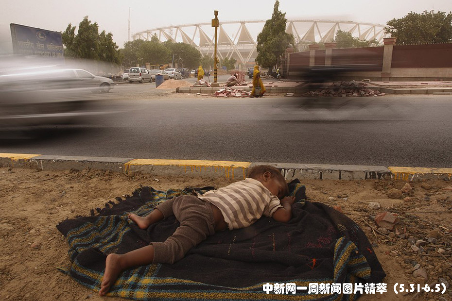 周四(3日),印度新德里,英聯邦運動會即將開幕。圖為一個孩子路邊熟睡。