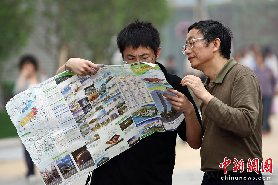 截至6月5日19點30分,上海世博會累計參觀者已超過1000萬人次。據悉,上海世博會的規劃用地為5.28平方公里,約242個國家和國際組織參展分布在浦東和浦西兩大區域。要想在這么大的地方找到自己想去的地方,那么世博地圖就是必須的裝備。圖為上海世博園內游客正在地圖上尋找自己要去的地方。中新社記者 杜洋 攝