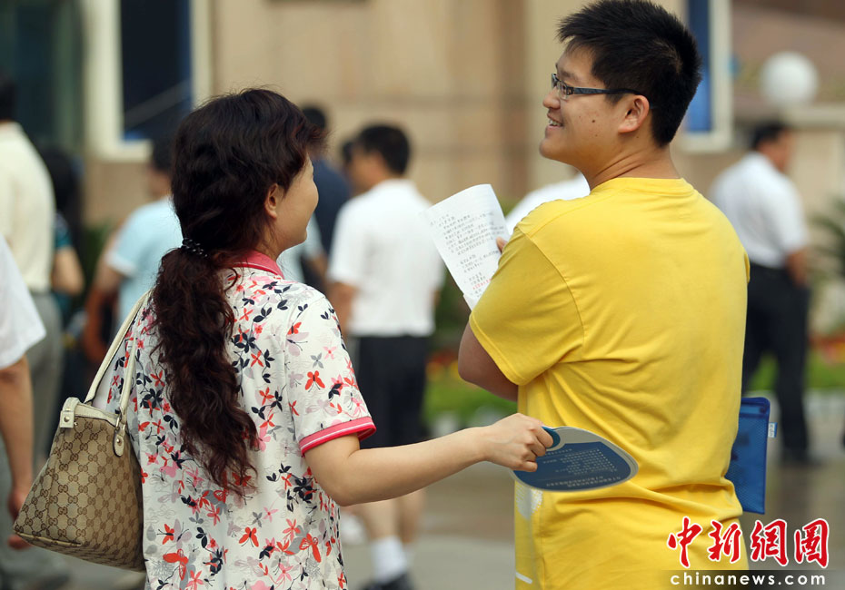2010年全國(guó)高考6月7日日拉開大幕,957萬(wàn)考生走進(jìn)考場(chǎng)。由于報(bào)名人數(shù)減少,而招生計(jì)劃增加,教育部預(yù)計(jì)今年全國(guó)高考平均錄取率將會(huì)增加近7%。圖為母親為兒子扇風(fēng)降溫。中新社發(fā) 蘇丹 攝