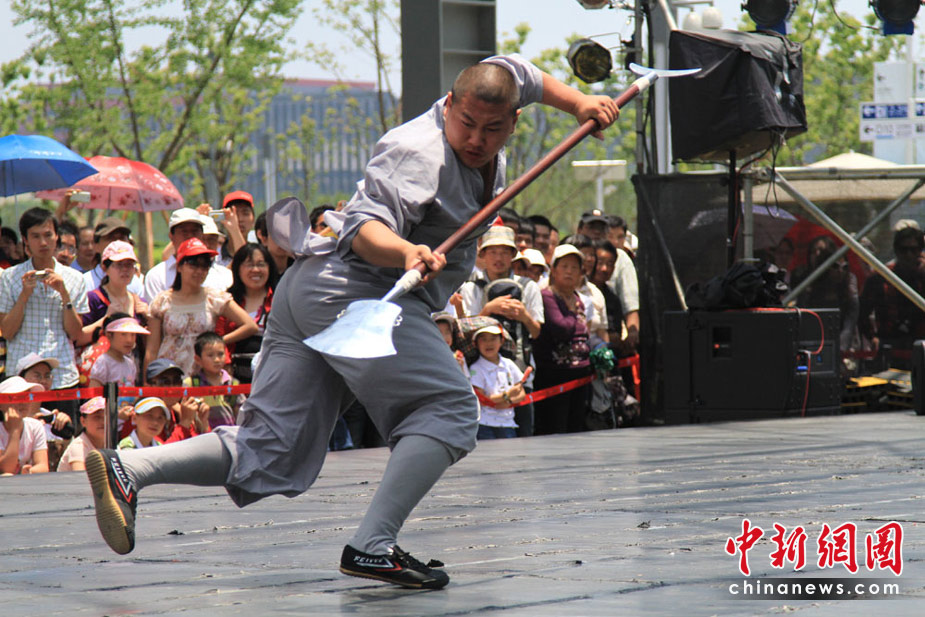 自5月1日開始,上海世博園D片區(qū)綜藝廣場(chǎng)每天都有少林寺功夫展演,受到世博參觀者的熱捧。中新社記者 殷春永攝
