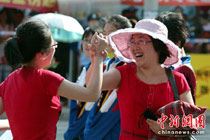 6月7日,為期兩天的2010年普通高等學(xué)校招生全國(guó)統(tǒng)一考試開(kāi)考,全國(guó)將有957萬(wàn)考生走進(jìn)考場(chǎng)。圖為高考第一天,遼寧丹東一中考場(chǎng)外的老師鼓勵(lì)準(zhǔn)備參加考試的學(xué)生獲得好成績(jī)。陳浩 攝