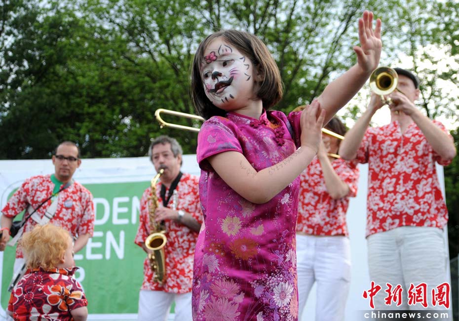 當地時間2010年6月6日,英國倫敦舉行卡姆登綠色市集(Camden Green Fair),這是英國倫敦每年環保領域的“重頭戲”。本屆市集的主旨是要喚起大眾對環境問題的關注,選擇更加可持續發展的生活方式。據活動主辦方預計,本屆市集將吸引來自英國各地和世界各國的2萬多人參加。圖為一名英國小女孩兒身著中式旗袍翩翩起舞,宣傳環保。Fiona/攝 Fiona 馬小剛/文