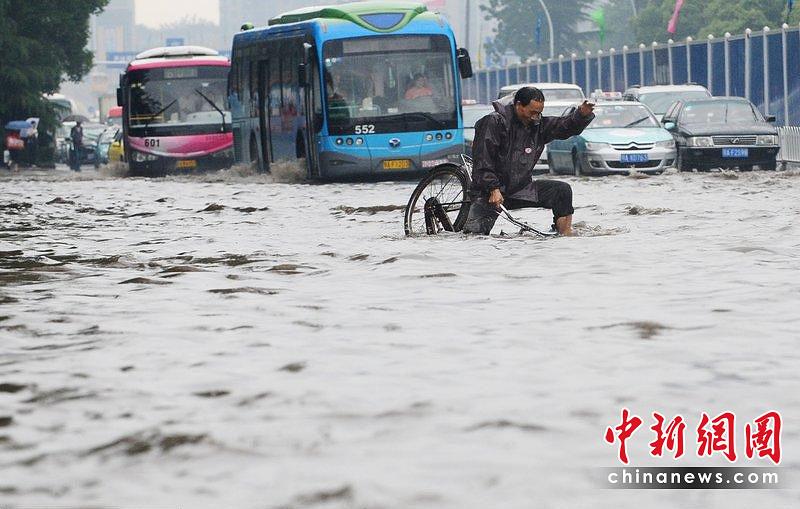 6月8日,武漢持續降雨,武昌徐東大街汪家墩段,300多米路面積水,最深處超過半米,車輛只得緩慢涉水而行。承影/CFP