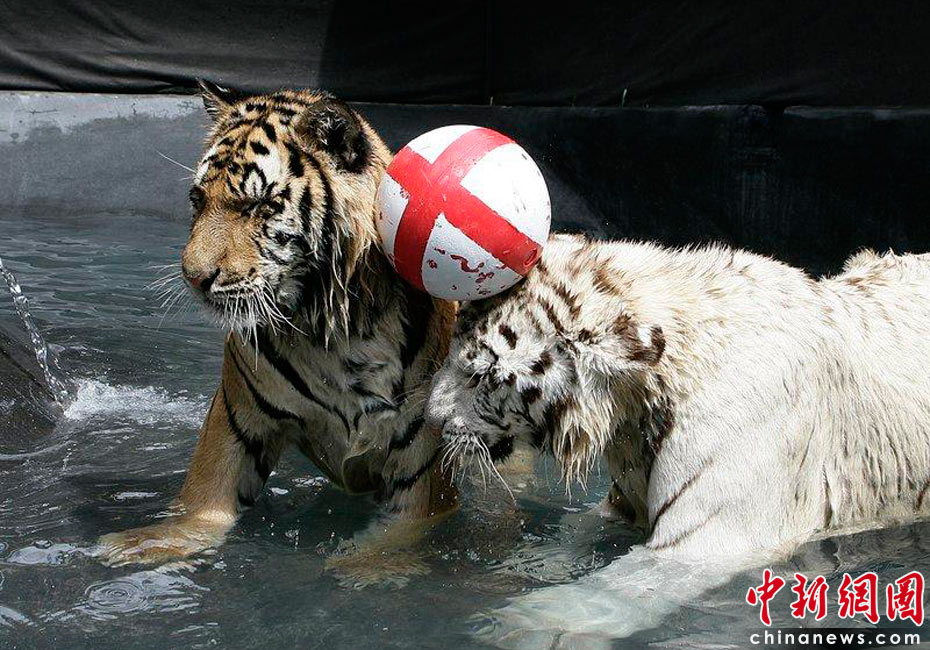 2010年6月7日,美國南卡羅來納州美特爾海灘,在世界杯即將開幕之際,一歲的小白虎Sundaram和孟加拉虎Mukti率先在水里上演了一出足球大戲。英格蘭隊首戰將對陣美國隊,因此足球外側也被印上了英格蘭旗的標志。cfp