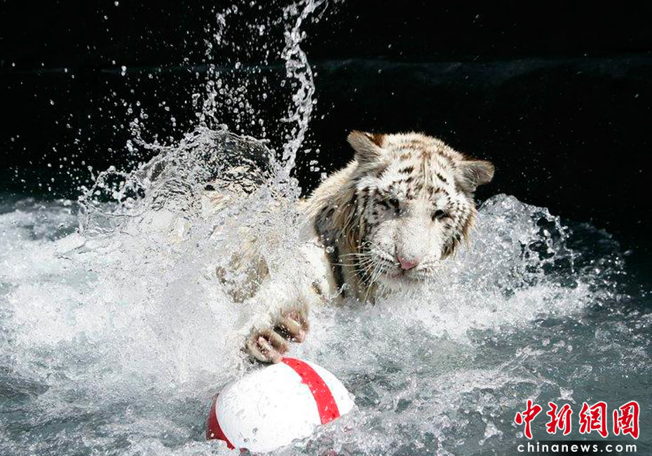 2010年6月7日,美國南卡羅來納州美特爾海灘,在世界杯即將開幕之際,一歲的小白虎Sundaram和孟加拉虎Mukti率先在水里上演了一出足球大戲。英格蘭隊首戰將對陣美國隊,因此足球外側也被印上了英格蘭旗的標志。cfp