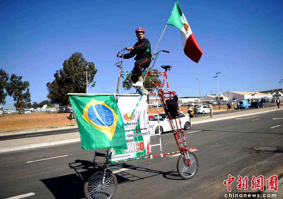 當地時間6月9日,南非約翰內斯堡足球城,一名球迷騎行特型自行車。中新社發 廖攀 攝