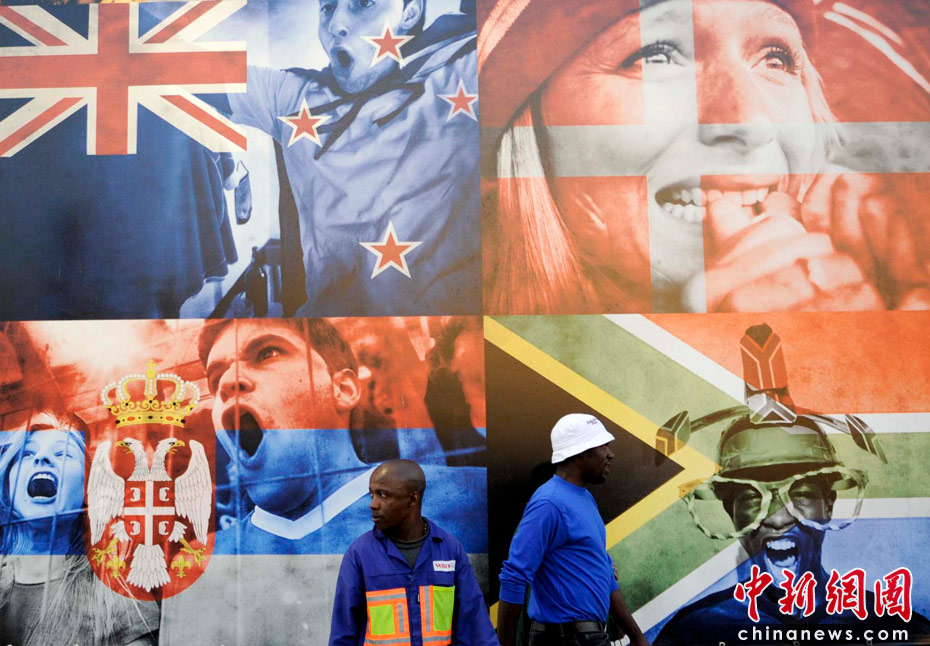 當地時間6月9日,民眾在南非約翰內斯堡街頭的世界杯宣傳畫前,非洲大陸即將首次迎來足球世界杯。中新社發 廖攀 攝