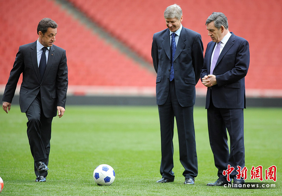 圖為2008年3月27日,法國總統薩科齊來到倫敦酋長球場,在英國首相布朗和英超勁旅阿森納隊主教練溫格面前“秀”了一下腳法。