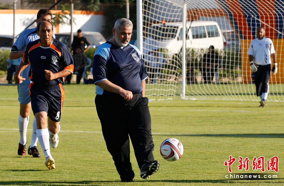 圖為2009年8月7日,加沙,巴勒斯坦伊斯蘭抵抗運動(哈馬斯)領導人哈尼亞在雅穆克體育場重新開放的儀式上大秀足球球技。