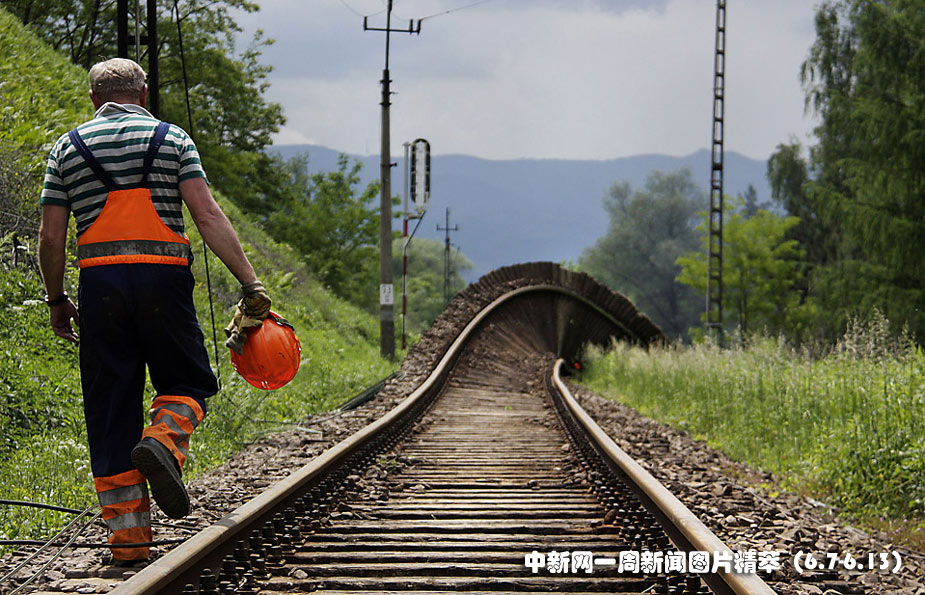 周二(8日),在波蘭Nowy Sacz附近,一名鐵路工人在扭曲的鐵道旁行走。近來(lái)的暴雨導(dǎo)致水位高漲,使軌道變形。