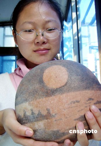 10月28日拍攝的天然奇石“嫦娥奔月”。當日,蘇州顧小姐展示一塊“嫦娥奔月”的黃河石,該石呈扁圓狀,寬34厘米、高40厘米,平滑的表面有一個直徑大約5厘米的圓,呈黃色,像一輪滿月。中新社發(fā) 李俊鋒 攝