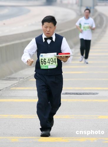 二月十七日,香港名氣最大的長跑賽事——渣打馬拉松賽開賽,約有超過四點九萬人參賽,創歷史新高。圖為一選手紳士打扮、手捧“紅心”在隊伍中十分搶眼。中新社發 武仲林 攝