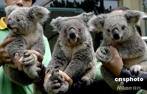 5月10日,以繁育技術一流著稱的廣州市香江野生動物世界,擁有無數的動物媽媽,人類的母親要過節,動物的媽媽當然也要過節。香江為給動物界繁育做出貢獻的廣大動物媽媽過一個快樂的節日,精心準備各種活動,對部分英雄媽媽還別開生面地舉行各式各樣的活動為她們送去節日的祝福。圖為雙胞胎的樹熊(考拉)母親淘淘及他的孩子,這也是第二代中國樹熊(考拉)家族的首次合影全家福。中新社發 劉衛勇 攝