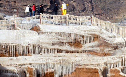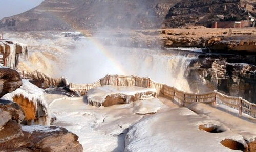 受連日來的強(qiáng)冷空氣影響,在地跨晉陜兩省的黃河壺口瀑布景區(qū),冰掛、彩虹和壯觀的瀑布相映成趣,吸引了眾多游人和攝影愛好者。閆銳鵬 攝