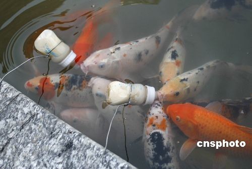 3月中旬,工作人員喂養“喝奶”的魚。在浙江東陽橫店影視城香港街景點內,養在水壇中的觀賞錦鯉是普通錦鯉與日本某錦鯉雜交后培育的品種,喂養它們則需要將飼料裝灌進嬰幼兒奶瓶中,該飼料的顏色如“乳奶”一般,然后將奶瓶用鐵絲系住放入水中,隨后,這些魚兒就會圍攏過來,爭搶著用奶嘴吸“奶”喝了。