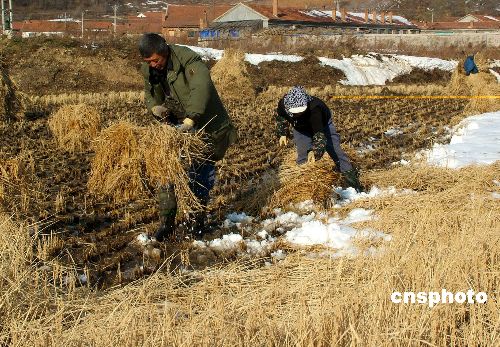 10月22日,黑龍江穆棱市河西鄉三興村農民在搶出被大雪覆蓋的水稻田。近日,黑龍江省牡丹江市局部地區突遭暴雪襲擊。轄區內的綏芬河市、穆棱市、林口縣、東寧縣等東部地區,降雪量達到了大雪及暴雪的程度,部分地面積雪厚達1米以上。此次出現的強降雪天氣,給當地農民的秋收工作造成較大影響。暴雪過后,牡丹江市涉農部門積極指導農民開展抗災自救,將農業生產的損失降到最低限度。中新社發 莊文斌 攝