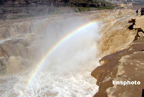 金秋十月,由于上游雨季影響水量倍增,長長的瀑布群沿黃河岸邊綿延一千多米,其中新增加的兩組大型瀑布寬度達到一百多米,頗為壯觀,加上艷陽高照,壺口瀑布出現美麗的彩虹,讓游客流連忘返。中新社發 閆銳鵬 攝