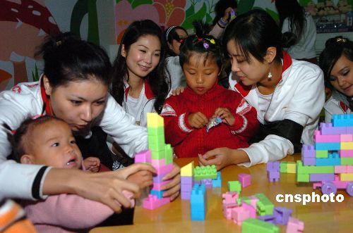 10月24日,“璽萌杯”第57屆世界小姐總決賽中國賽區參賽佳麗,來到北京豐臺區兒童福利院,把她們的笑容和愛心帶給這里的孩子們。大賽贊助商“璽萌”公司向福利院捐贈了十萬元資金。中新社發 樊建恩 攝