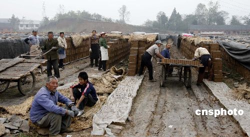 十一月五日,河南省淅川縣一處磚窯場工人正在生產磚坯。這家磚窯場曾經被查處,據一位民工透露,大約兩三個月前,這里仍有不少“黑工”在干活,現在都轉走了,只剩下少數本地民工。中新社發 慎重 攝