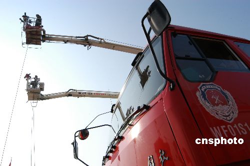 2007年11月7日,山東濰坊消防部門在濰坊富華國際展覽中心舉行消防演習,迎接11月9日消防日的到來。中新社發 王志德 攝