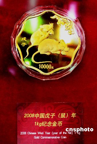 11月9日,一重達1千克的2008中國戊子(鼠)年生肖紀念金幣首次出現在第三屆北京金融博覽會。據悉,這套鼠年生肖紀念金幣將于今年年底正式發售,其中最重的單枚戊子(鼠)年紀念金幣重達10公斤。本次金博會主題為“投資、融資、理財”,匯集銀行、基金、證券、保險等一百多家金融機構,推出一千多個金融產品參展。中新社發 鄭雄增 攝