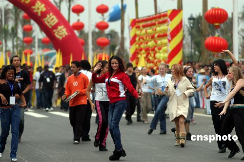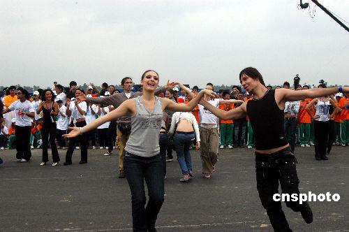 2007年11月16日,外國朋友在海南瓊海跳起歡樂之舞。為期三天的第八屆中國海南歡樂節(jié)將于當(dāng)天下午開幕,海南全省放假一天。當(dāng)天上午,出席開幕式的各國朋友和海南各族群眾在歡樂節(jié)主會(huì)場(chǎng)情不自禁地跳起歡樂之舞。中新社發(fā) 蒙鐘德 攝