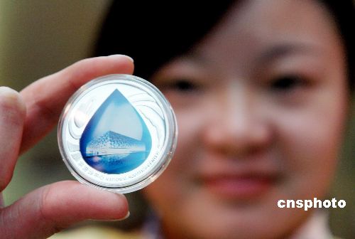 2007年11月16日,經北京奧組委授權,中國金幣總公司近日起發行北京2008奧運會場館紀念章。場館紀念章主題圖案采用了國家游泳中心——“水立方”為主要設計元素,并刊“第29屆奧林匹克運動會場館紀念”中英文字樣,采用鏡面、噴砂、高浮雕及彩色移印等造幣工藝,充分展現了高科技含量的設計鑄造技術。中新社發 馬健 攝