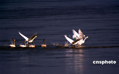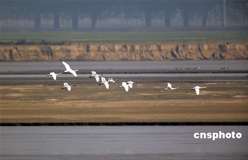 十一月二十日,來(lái)自北方的大天鵝在鄭州黃河上空飛翔、在水中嬉戲。這是今年入冬以來(lái),發(fā)現(xiàn)的大天鵝最大的種群。連日來(lái),鄭州黃河濕地保護(hù)區(qū)工作人員連續(xù)在保護(hù)區(qū)內(nèi)進(jìn)行鳥(niǎo)情觀察,共發(fā)現(xiàn)國(guó)家二級(jí)保護(hù)動(dòng)物大天鵝九十三只和灰鶴兩只,以及大種群分布的豆雁一千三百余只,綠頭鴨五百三十只,大白鷺三百三十二只。據(jù)推算,各種水鳥(niǎo)達(dá)到三十萬(wàn)只。中新社發(fā) 慎重 攝
