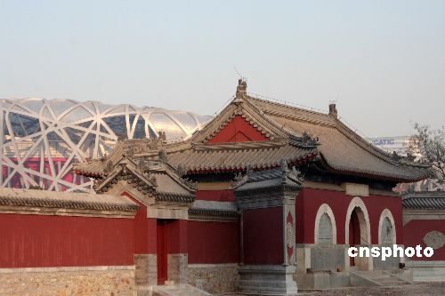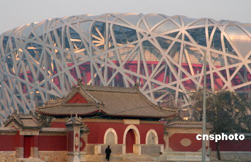 12月4日,北京奧運會主會場“鳥巢”、國家游泳中心“水立方”與附近的中國古代建筑相映成趣,宏偉的國家體育場和明代的娘娘廟讓現代與傳統完美結合。中新社發 吳芒子 攝