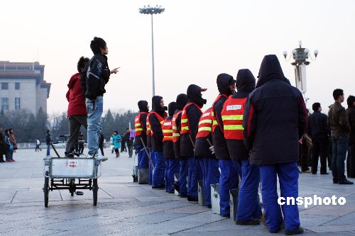 12月7日,在北京天安門廣場,一批環衛工人集體列隊觀看降旗儀式。北京氣溫已近零攝氏度,但人們觀看的熱情仍然不減。中新社發 鄭雄增 攝