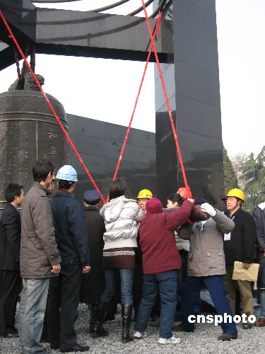 十二月十三日十時,江蘇省各界人士八千多人在新落成的侵華日軍南京大屠殺遇難同胞紀念館新館前的和平廣場隆重舉行“悼念侵華日軍南京大屠殺三十萬同胞遇難七十周年暨侵華日軍南京大屠殺遇難同胞紀念館擴建工程竣工儀式”。南京大屠殺幸存者代表、青少年代表、擴建工程建設者代表放飛和平鴿,并撞響了“和平大鐘”。中新社發 朱曉穎 攝