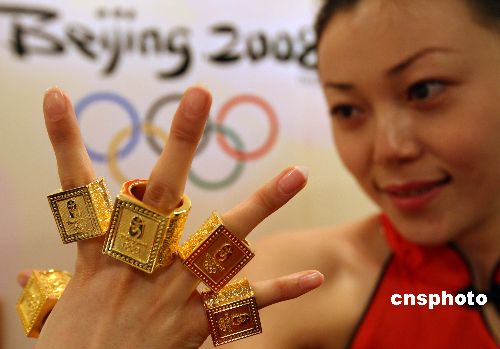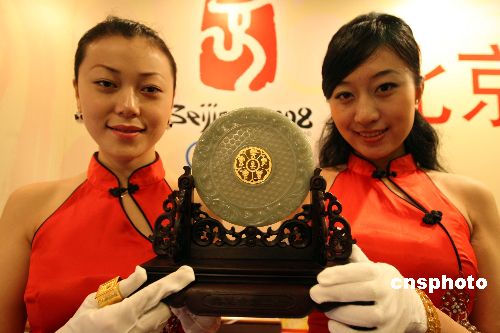 十二月十九日,由北京繁榮文化發(fā)展有限公司推出的五十余款奧運(yùn)紀(jì)念章與消費(fèi)者見面,此舉使得北京奧運(yùn)特許商品這一大家族又增添了“新成員”。這些限量發(fā)行的“新成員”,多為大眾化商品,價(jià)格在一百元人民幣的就有二十多種,內(nèi)容涉及不同題材,如體育、科技、文化、城市等,其中最吸引人的還是設(shè)計(jì)制作獨(dú)特的奧運(yùn)金章玉璧等高端商品。中新社發(fā) 任海霞 攝