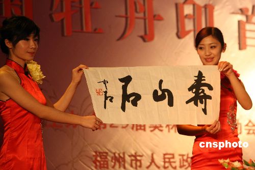 十二月二十日,北京奧組委在奧林匹克大家庭總部飯店北京飯店舉行壽山石奧運特許商品“中國牡丹印”首發儀式。歷史悠久、雕工精美的壽山石印,承載著“中國印·舞動的北京”與印鈕部分國色天香、雍容華貴的牡丹交相輝映。此次隆重推出的“牡丹印”是壽山石奧運文化精品系列的首批代表作,限量2008枚。該印采用中華國石之首壽山石與國花牡丹相結合,選材為“中華印石三寶”的壽山芙蓉石脈,可稱得上是精品中的精品。中新社發 任海霞 攝