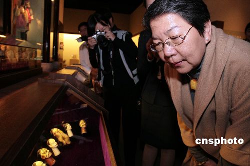 十二月二十三日,臺灣著名女詩人、散文家、畫家席慕容來到福建泉州中國閩臺緣博物館參觀,當她看到兩岸傳統習俗和傳統技藝展示時大為感動,像回到了童年時代。圖為席慕容在木偶頭像前駐足了許久。中新社發 傅丹丹 攝