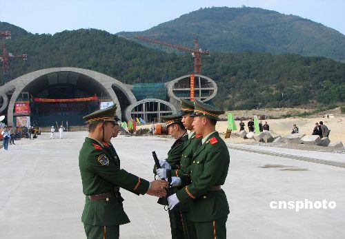 十二月二十四日,“南海一號”靠近碼頭等待漲潮后登陸,中國海事巡邏船、公安邊防艇在海上層層保衛,同時,警戒線已經在岸上的博物館兩翼撒開,嚴禁無關人員進入。圖為在海上絲綢之路博物館前執勤的武警。中新社發 索有為 攝