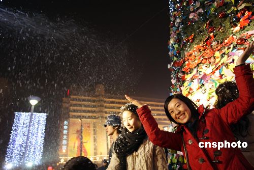 12月24日,北京西單街頭的一棵許愿樹前下起了“大雪”。這是商家為營造新年氣氛,利用造雪機給人們帶來的驚喜。不少年輕人一邊感受“雪天”的浪漫,一邊在貼紙上寫下祝福的話語掛在許愿樹上。中新社發 聞昭 攝