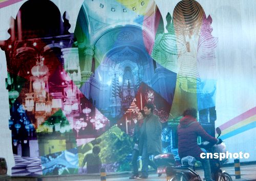 2008年新年伊始,北京市中心街頭矗立起巨大的“感受澳門”宣傳圖,讓民眾在隆冬時節了解澳門文化遺產、感受“南國”春光明媚、五彩繽紛的景象。中新社發 趙振清 攝