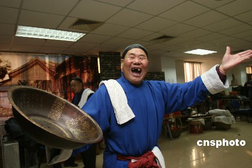2008年1月8日,來自崇文區文化館老北京民間藝術團的部分成員正在緊鑼密鼓地為將要在鼠年龍潭廟會上表演的老北京叫賣情景劇排練。隨著新春佳節臨近,京城各大廟會都在精心準備豐富多彩的文化活動。中新社發 陳曉根 攝