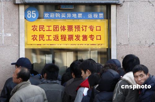 1月11日,北京火車站農民工返程票發售?谇芭艥M購票人。北京鐵路局今年首次在北京站、北京西站進行試點,為農民工辦理返程票。自元月11日至31日,兩車站開設“農民工返程票售票專口”,發售2月10日至20日由始發車站返回北京的硬座車票。中新社發 杜洋 攝