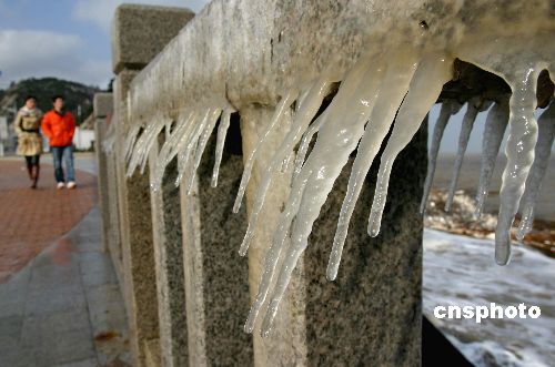 1月14日,受冷空氣影響,江蘇連云港持續出現大風降溫天氣,最低氣溫零下5攝氏度。在偏北風作用下海上生成巨浪,濺在海岸邊護欄上的海水凍結成冰凌。中新社發 王健民 攝