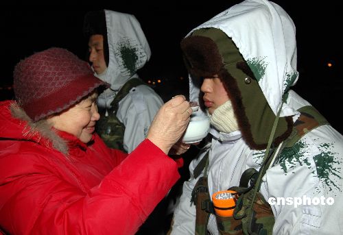 1月15日,農歷臘月初八,黑龍江省十大杰出擁軍模范、首屆十佳“兵媽媽”王秀蘭,在黑河市封凍的界江哨位,將親手熬制的臘八粥送到執勤的“黑河好八連”士兵口中。中新社發 邱齊龍 攝