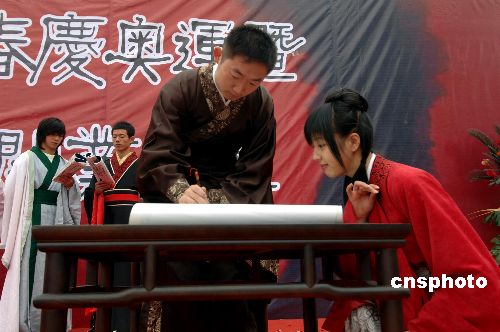 一月十八日,福州漢服愛好者正在表演情景劇。當日,福州漢唐文化藝術中心隆重開業,熱衷追逐古典文化的福州漢服天下工作人員上臺表演助興。中新社發 王東明 攝