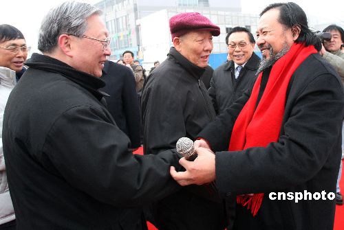 圖為全國人大副委員長、中國科學院院長路甬祥與雕塑藝術家遙遠雕塑(右)先生握手表示祝賀。