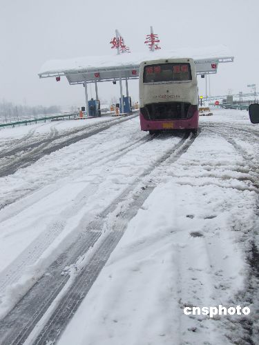 1月20日,安徽六安境內合六葉高速公路關閉,一輛客車滯留在收費站口。該市連日普降中到大雪,南部山區局部暴雪。降雪已造成該市各縣區普遍受災,山區縣災情比較嚴重。目前尚未有人員傷亡報告,全市各縣區正組織干部群眾全力抗災救災。中新社發 曉遠 攝