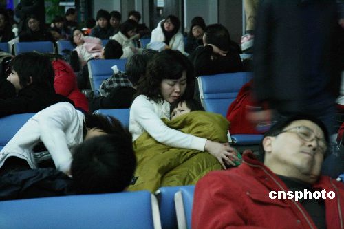 1月27日消息,1月13日以來,湖南省遭遇1954年以來,50年不遇的、持續時間最長、氣溫最低的冰凍天氣,長沙機場受冰雪天氣影響,飛機跑道結冰,導致大面積航班取消或延誤,25日當晚19點15分機場開始關閉,場內2000多名已辦登機手續或途經此中轉的返鄉乘客滯留在候機廳內。中新社發 蘇巧帥 攝