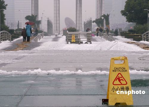 1月28日,上海城鄉大雪紛飛,上海氣象臺再次發布道路結冰警報。圖為提醒路人防滑的警示牌在上海的公共場所隨處可見。中新社發 個路 攝